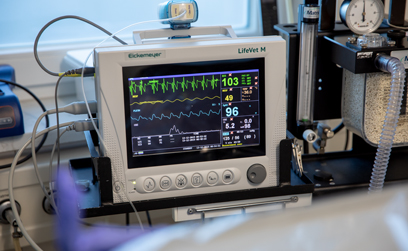 Alle größeren Eingriffe werden in unserer Praxis mittels kreislaufschonender Inhalationsnarkose einschließlich Monitorüberwachung durchgeführt. Das heißt, der Patient wird an ein Beatmungsgerät angeschlossen und erhält über dieses Sauerstoff und das erforderliche Narkosegas. Dadurch kann die Narkose ganz nach Bedarf aufrechterhalten und gesteuert werden. Dies ist wesentlich kreislaufschonender als eine schlecht steuerbare Injektionsnarkose. Zur Sicherheit für Ihr Tier werden in unserer Praxis über technische Überwachungsgeräte, wie Pulsoxymeter und Capnograph, während der gesamten Narkose ständig die Vitalfunktionen, wie Puls, Atemfrequenz, Sauerstoffsättigung und CO²-Gehalt, ähnlich wie in der Humanmedizin, überwacht. Selbstverständlich bekommt der Patient für die Dauer des Eingriffs und auch danach über einen Venentropf Flüssigkeit zugeführt. Dadurch können eventuelle Kreislaufdefizite ausgeglichen werden und u. U. erforderliche Medikamente sofort intravenös verabreicht werden. Zudem fördert dies die Durchblutung der inneren Organe, wie z. Bsp. der Nieren, was insbesondere bei älteren oder kranken Tieren unerlässlich ist. Zudem wird der Patient während einer Operation mittels Wärmematte und ggf. mittels Infusionswärmer gewärmt.