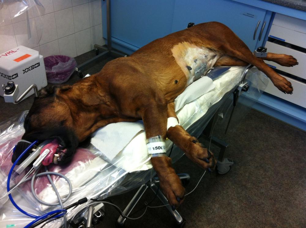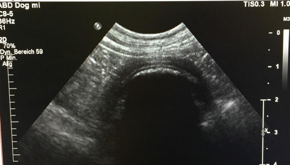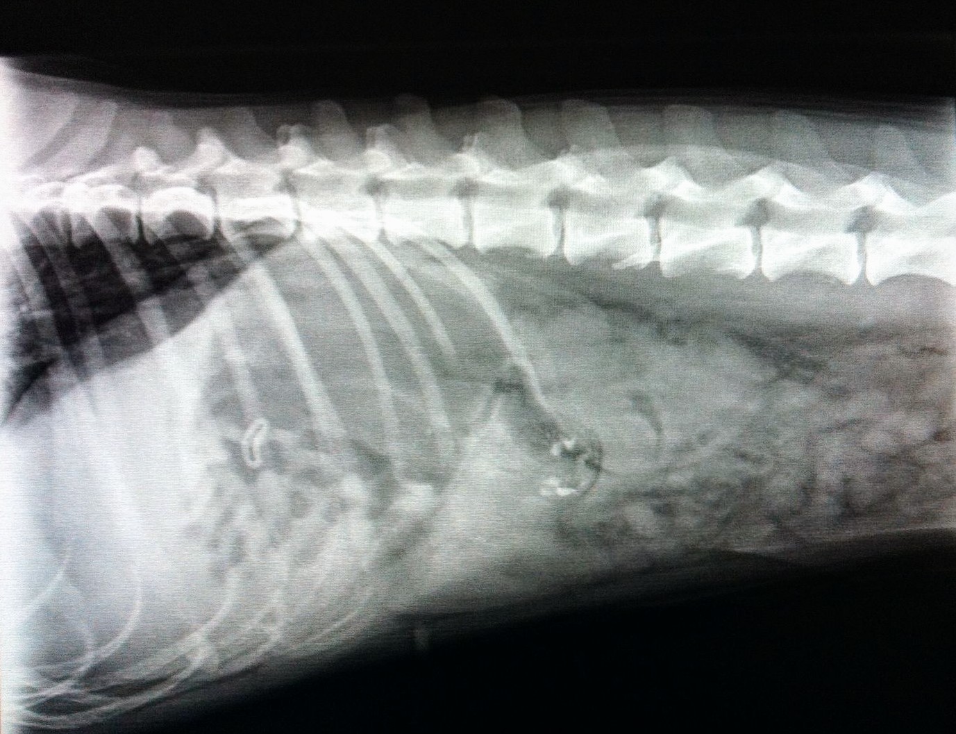Sie wurde mit einer Schwäche der Hintergliedmaßen vom Haustierarzt ans Kleintierzentrum überwiesen. Nach Röntgen und Ultraschall stand fest, das die Schwäche nur sekundär zu einem Fremdkörper im Bauch des Hundes vorlag. Dieser war bereits vom Magen in den Dünndarm gewandert und verursachte einen Ileus (lebensbedrohlichen Darmverschluss). Aura's Blutwerte zeigten bereits einen massiven Flüssigkeitsverlust und erhöhte Entzündungszellen an, sodass es sich hier nicht um ein orthopädisches, sondern ein chirurgisches Problem handelte und sofort operiert werden musste.