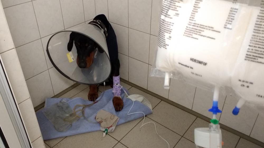 In einem mehrstündigen Eingriff wurde die Blase vernäht, der Bauchraum gespült und Drainagen eingelegt. Danach wurde Baron engmaschig überwacht, es stand sehr schlecht um ihn. Keiner konnte sagen, ob sich das Blasengewebe und die Nieren wieder erholen würden. Er brauchte sehr lange um aus der Narkose zu erwachen. Um seine vielen Drainagebeutel "unterzubringen" wurde ihm ein Body angezogen, permanent wurde die Körpertemperatur, Harnproduktion und der Herzkreislaufzustand kontrolliert. Die Bauchdrainagen mussten oft gespült werden. Gut das es sich bei Baron um einen soooo lieben Patienten handelte! Trotz päppeln, pflegen, Medikamentengabe und besserwerdenden Blutwerten, wollte Baron keine Nahrung aufnehmen. Daher entschieden wir uns den Hund parenteral -also über die Vene- zu ernähren.
