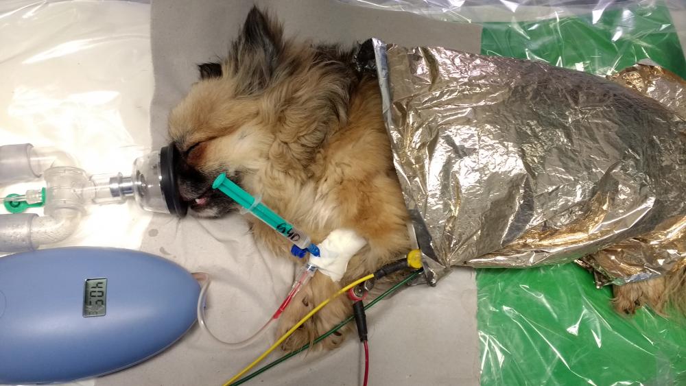 Mufinkas Zustand war viel ernster als die zuerst vermutete "normale" Geburtsstockung. Sie hatte graue Schleimhäute, eine starke Untertemperatur und war kaum mehr ansprechbar. Mehr tot als lebendig wurde ein Venenkatheter gelegt und die Hündin während des Trächtigkeitsultraschalls schockbehandelt. Wider erwarten lebten alle Welpen noch, sodass umgehend ein Notkaiserschnitt vorgenommen wurde. Im Eiltempo wurde der Hund für den OP vorbereitet. Mufinka meisterte den Kaiserschnitt mit Bravour. Vier kleine Chihuahuas erblickten das Licht der Welt.