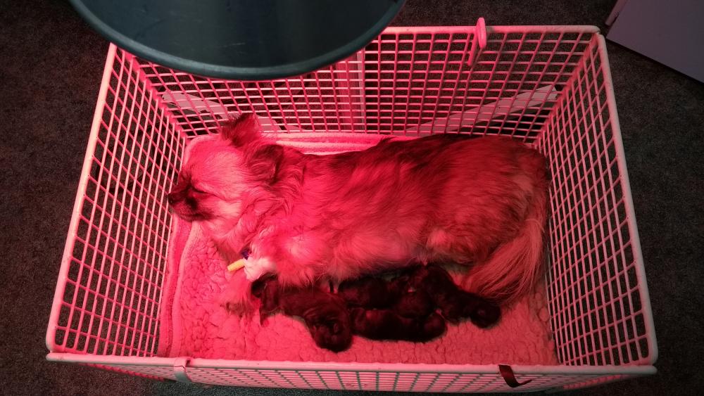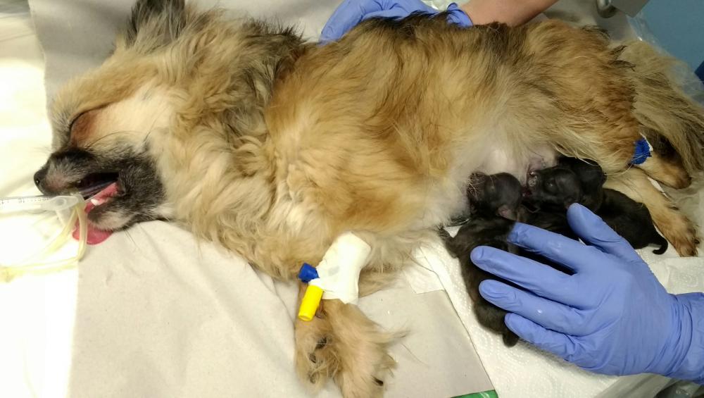 Schon nach kurzer Zeit hob Mufinka ihren Kopf und begrüßte ihre Babys auf der Welt. Sie blieb allerdings sehr schwach und trotz der Behandlung des Akuten Nierenversagens und der Korrektur von niedrigen Glucose-, Calcium-, und Kaliumwerten - den typischen Komplikationen im Geburtszeitraum- waren wir mit ihrem Zustand nicht zufrieden. Tierärztin Lucie Krejcova und Tierarzthelferin Isabel Bauer betreuten Mama, Babys und vier weitere Intensivpatienten die ganze Nacht über. Am Tag nach der Geburt erhielt Mufinka auf Grund einer präpartal entwickelten Blutarmut noch eine Vollbluttransfusion und diese wendete das Blatt. Am folgenden Tag konnten die Hündin und ihre vier Babys die Praxis verlassen.