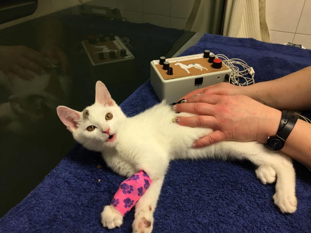 Willis Blutwerte haben sich weiter verbessert. Wegen einer Einblutung ins Rückenmark konnte er anfangs nicht stehen oder gehen. In der Physiotherapie "lernt" er nun wieder laufen. Hier bekommt er gerade eine Interferenzstrom-Behandlung. Wir sind zuversichtlich Willi bald in die liebevolle Pflege seiner Familie entlassen zu können!