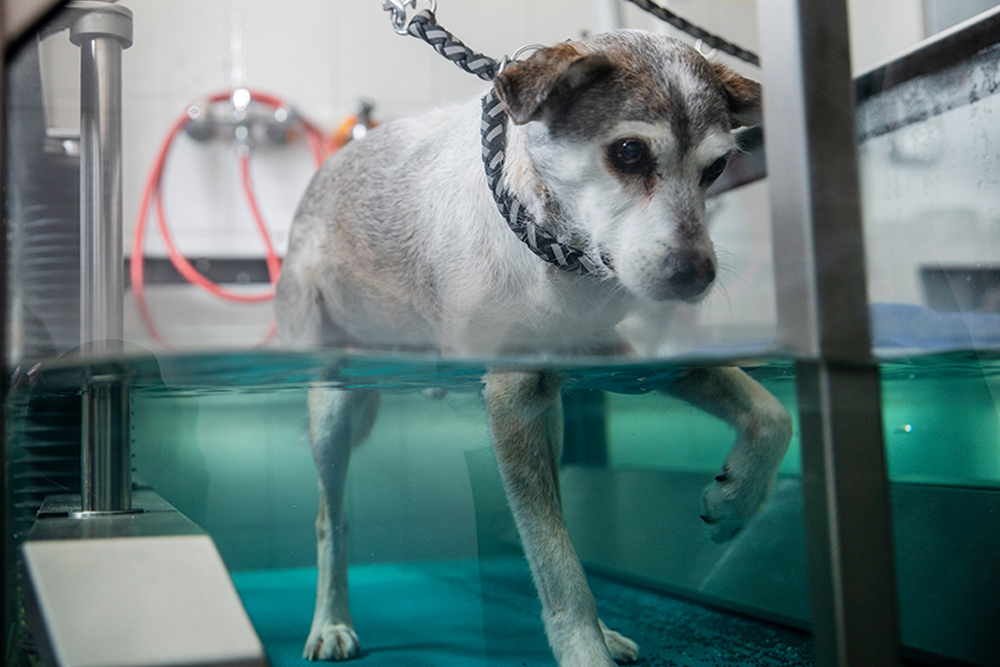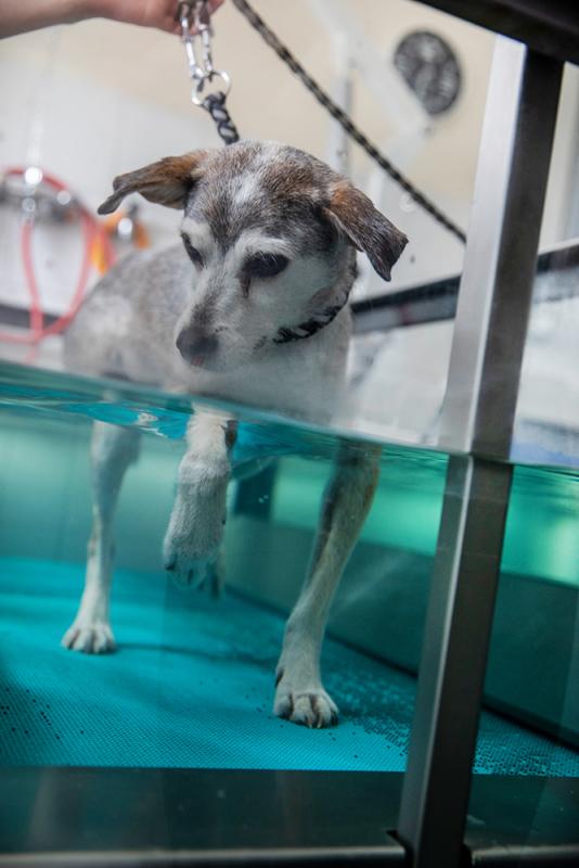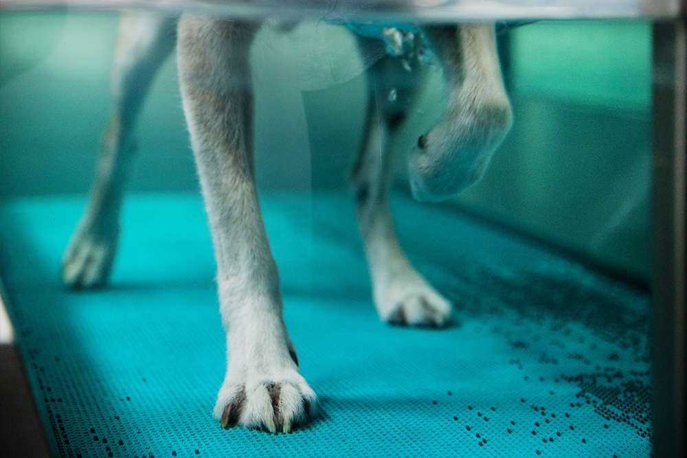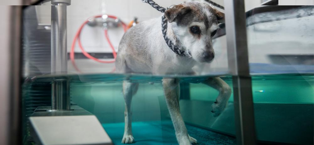 Für eine umfassende Therapie bieten wir in unserer Praxis die Arbeit auf dem Unterwasserlaufband an. Diese Form der Hydrotherapie kann sowohl bei orthopädischen, als auch bei neurologischen Erkrankungen eingesetzt werden. Die physikalischen Eigenschaften von Wasser können so für die Therapie nutzbar gemacht werden: Der Körper ist im Wasser leichter, unter Wasser ist deshalb eine schmerzfreie und weniger Kraft erfordernde Bewegung der Gelenke möglich. Gleichzeitig fördert die Bewegung gegen den Wasserwiederstand Muskelaufbau und Muskelkraft und trainiert den Kreislauf. In kürzester Zeit laufen die Patienten beschwerdefrei, da die Bewegung im Wasser nicht vermieden wird, sondern die Tiere von sich aus die korrekten Bewegungen ausführen. Die Rekonvaleszenzphase nach orthopädischen Operationen kann dadurch entscheidend verkürzt werden. Die Arbeit im Wasser verbessert beim neurologischen Patienten außerdem die Steh- und Koordinationsfähigkeit schon zu Beginn der Heilungsphase.